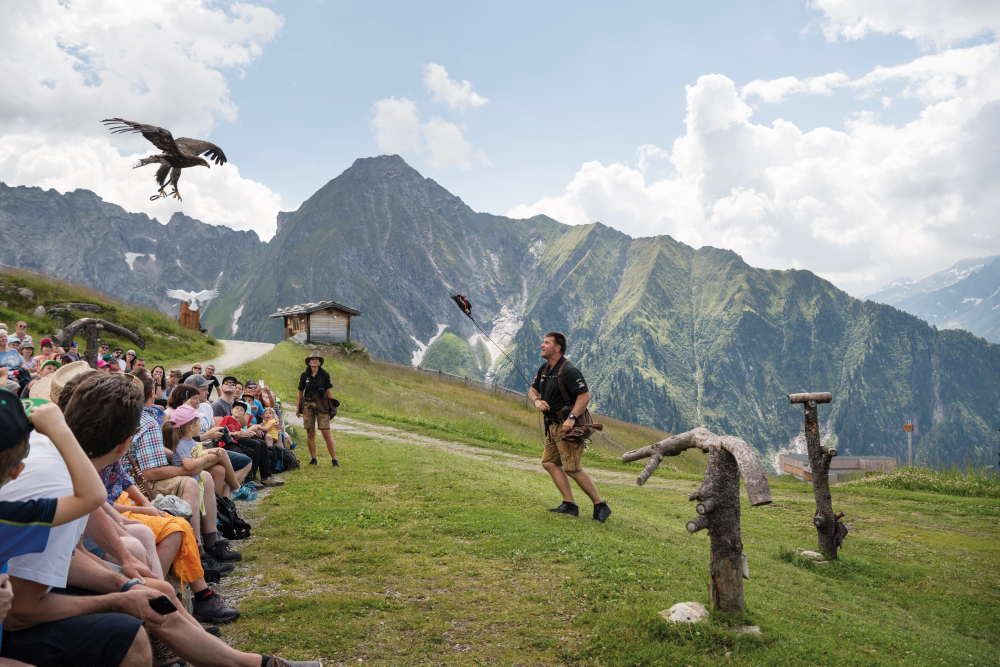 Erlebe die spektakuläre Greifvogelschau bei der Adlerbühne auf 2.000 m Seehöhe mit Backstage-Führung und erfahre Wissenswerte Details über die Könige der Lüfte.